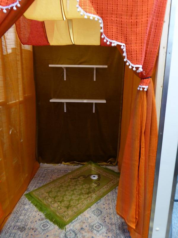| Occupant tout le fond de la bâtisse, on découvre un plateau nu, dont on comprend qu’il a une fonction centrale dans la vie de l’équipement. Une estrade permet d’y tenir des conférences ou de petites représentations, l’espace étant aéré et modulable. un petit espace de stockage pour des chaises est dissimulé par un paravent. Enfin, dans un coin discret, un petit espace de prière et de méditation.Enfin, dans un coin discret, un petit espace de prière et de méditation. |