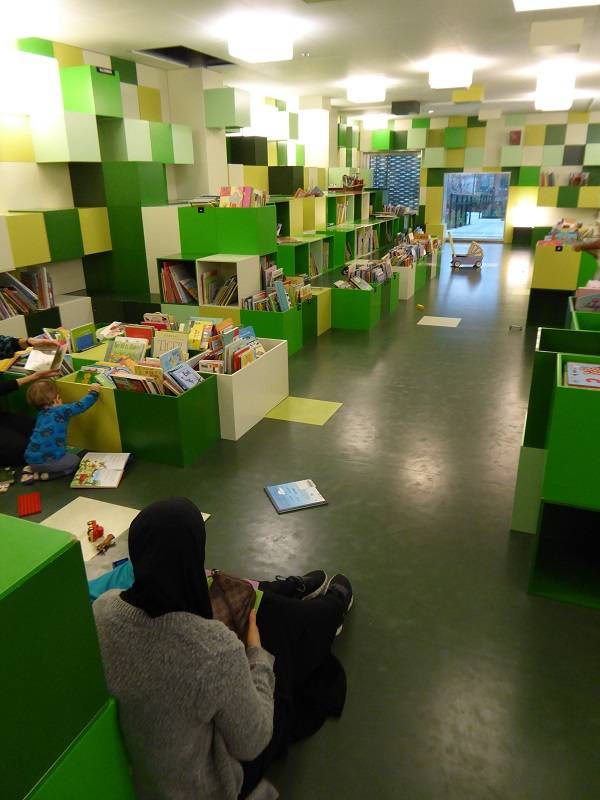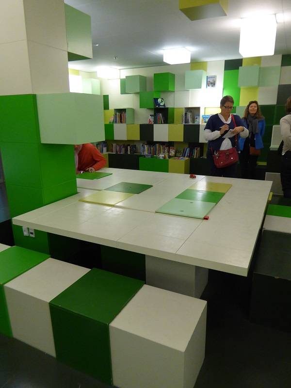 La GROTTE pour les enfants au RDC, espace composé de boites vertes sur lesquelles les enfants peuvent grimper ou s’installer pour lire les documents dans les bacs. Le café sert des brunchs le dimanche et comme la grotte est située en face c’est très fréquent que les parents soient au brunch et les enfants dans « la grotte ».