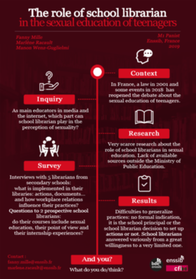 Fanny Mille et Marlène Racault se sont basées sur plusieurs événements de 2018 reliés à la thématique de la sexualité des adolescents : la proposition d’abaissement de l’âge du consentement sexuel et les diverses publications de littérature jeunesse qui ont alors fait polémique (Petit Paul de Bastien Vivès ou On a chopé la puberté de Séverine Clochard). Ce qui les a menées à s’interroger sur le rôle de l’école dans l’éducation à la sexualité des adolescents. Un questionnement s’est alors imposé : comment le professeur-documentaliste s’inscrit-il dans cette éducation ?